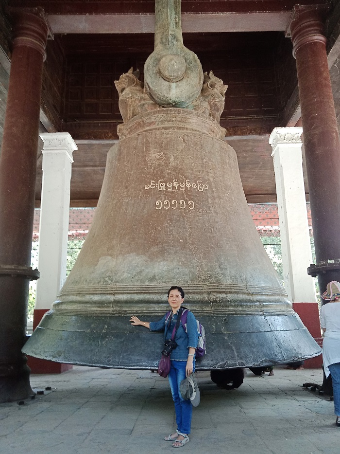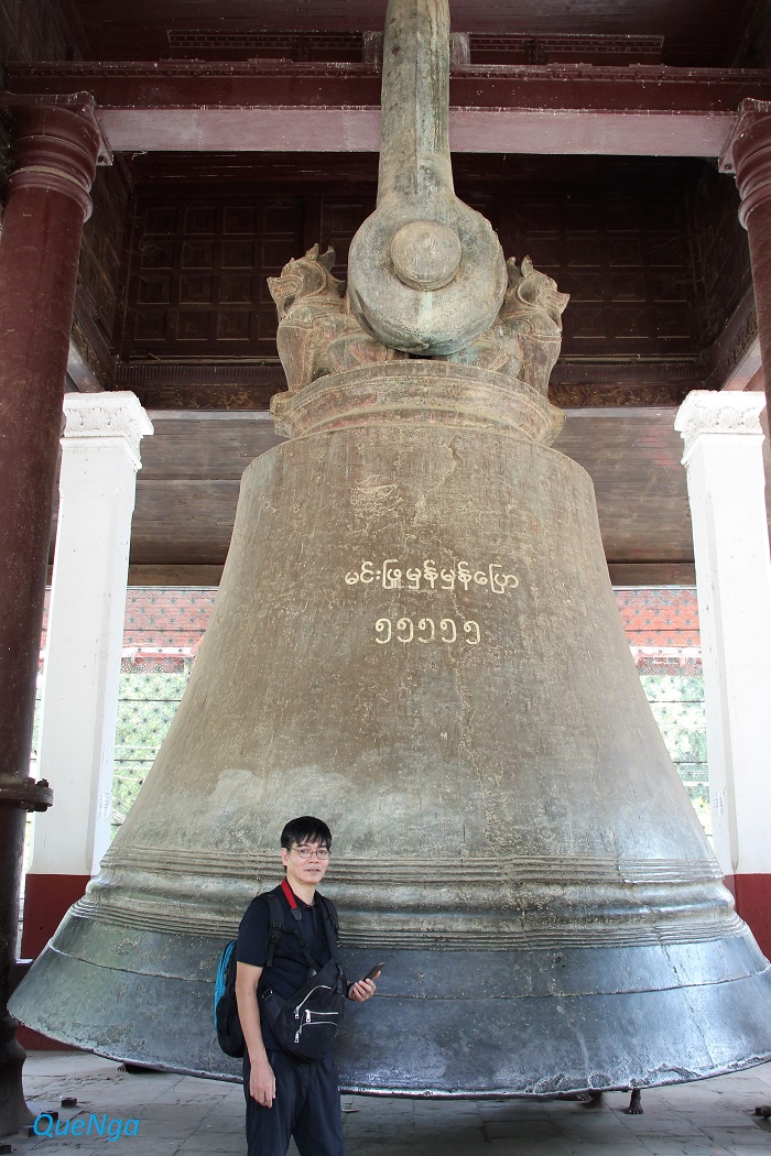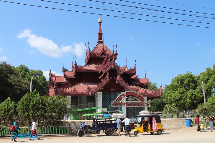 Quả chuông được đặt trong ngôi chùa có mái tầng truyền thống của Miến Điện.