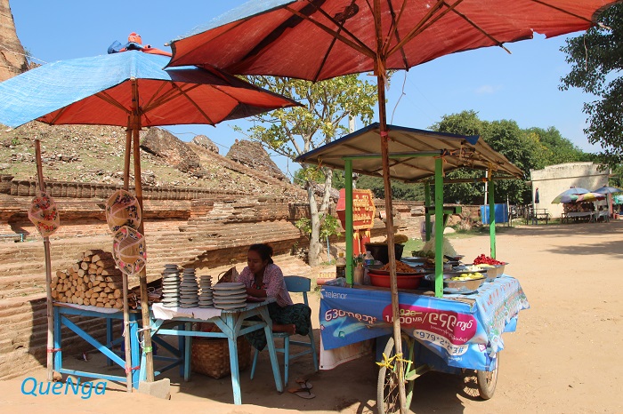 Phía trước chùa có khá nhiều hàng quán bán đồ lưu niệm và Thanaka – loại bột cây đươc mài ra để bôi lên mặt bảo vệ da.